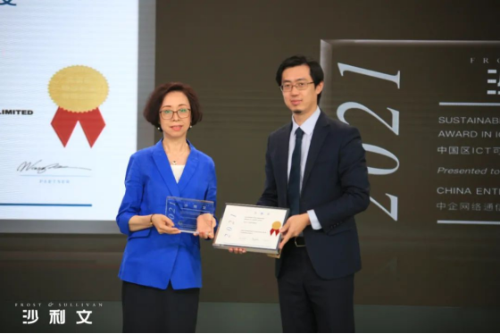 贾庞先生为中企网络通信技术有限公司高级销售经理王慧女士颁发“2021年度中国区ICT可持续价值创新奖”