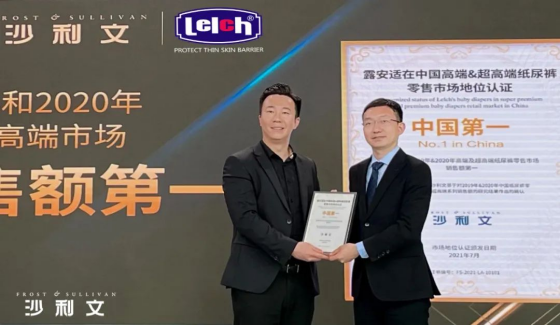 张葛建先生为露乐集团EC事业部总经理邓胤先生颁发露安适2019年和2020年纸尿裤高端及超高端市场“中国销售额第一”认证