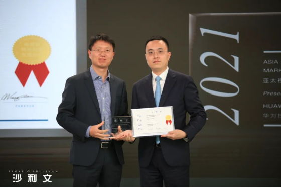 陆景先生为华为智能协作领域产品管理部部长陈群辉先生颁发“亚太视频会议市场领导奖”