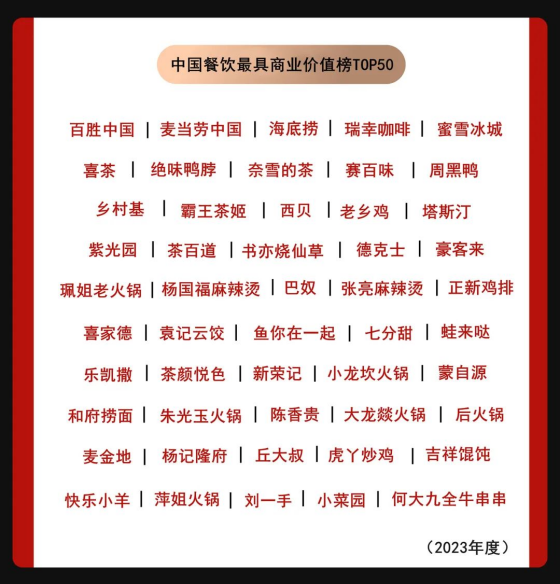 ■ 中国餐饮最具商业价值榜TOP50榜单(2023年度)