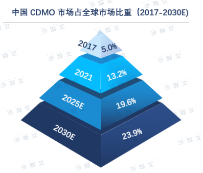 CDMO 在药物创新产业链中起到重要角色,伴随着我国创新药物研发的业态的快速发展,CDMO 行业的发展势头强劲,近年来迎来了快速增长,2017 年至 2021 年,中国 CDMO 市场规模从 132 亿元增长至 473 亿元,复合年增长率为 37.7% 。预计 2025 年将达到 1,571 亿元,2030 年将达到 3,559 亿元。我国 CDMO 行业显现出高于全球水平的快速增长,中国 CDMO 市场占比全球市场比重逐年增长。2017 年中国 CDMO 市场仅占全球 CDMO 市场总规模的 5.0%,到 2021 年已扩大至 13.2%,预计于 2025 年之后将占据全球市场的五分之一。