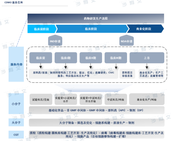 CDMO 提供具有技术附加值的研发服务和产能支持,贯穿研发的各个阶段。CDMO 企业为制药企业搭建的服务范围包括临床前期和临床阶段的 CMC 服务、原料药、中间体、制剂的工艺开发生产和包装服务等。在药物研发阶段,CDMO 可提升药物研发效率、降低研发成本;在药物商业化阶段,CDMO 可通过不断的工艺优化降低企业生产成本、提高生产效率,同时保障产品质量和供应的稳定性。