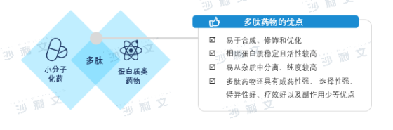 多肽药物相比于小分子化药及蛋白质类药物的优势在其发展过程中被逐渐发掘,在质量控制水平方面接近小分子化药,活性上接近于蛋白质药物,兼具二者优点,由于多肽药物具有较高的活性及选择性,其在治疗复杂疾病方面优势明显。