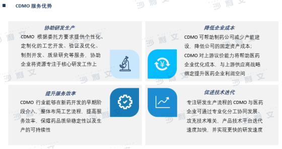 《报告》阐述了 CDMO 行业作为医药研发生产的重要参与者,将从以下四个方面赋能制药企业:协助研发生产、降低企业成本、提升服务效率以及促进技术迭代。