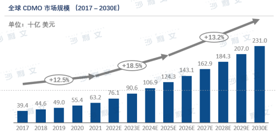 《报告》对全球以及中国 CDMO 市场规模进行了估计, 从全球视角来看,CDMO 行业处于持续放量发展的趋势,保持较高的市场景气度,2017 年至 2021 年,全球 CDMO 市场规模从 394 亿美元增长至 632 亿美元,复合年增长率为 12.5% ,预计 2025 年将达到 1,243 亿美元,2030 年将达到 2,310 亿美元。