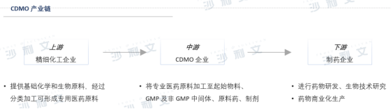CDMO 行业的上游为负责提供基础化学原料的精细化工企业,通过分类加工可制备专用医药原料。原料药的制备是药物研究和开发的基础,其主要目的是为药物研发过程中药理毒理、制剂、临床等研究提供合格的原料药,为质量研究提供信息,保证生产工艺的稳定可行。CDMO 企业对原料进行质量验证,并将专业医药原料加工至起始物料、中间体、原料药、制剂提供给下游的制药企业、生物科技公司、学术性的研发机构等。