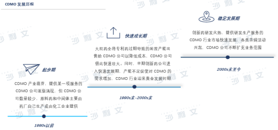 CDMO 由 CMO 演变、迭代升级而来,随着制药企业之间的竞争日愈剧烈,传统 CMO 企业进行的简单代工生产无法满足药企降本增效等需求,在此基础上,能够利用自身生产设备及技术优势帮助制药企业优化生产工艺、进行定制规模化生产的 CDMO 企业随之出现。CDMO 行业自萌芽起始阶段不断发展,目前已进入稳定发展期。