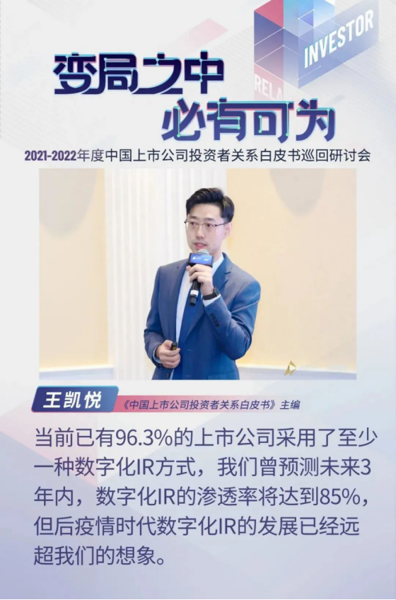 根据最新IR白皮书数据,超过96%的上市公司已经采用数字化IR方式,其中81%的公司采用在线视频、语音会议进行IR工作,在研讨会演讲中,各位嘉宾也频繁提到“数字化IR”的现状及创新应用,显然数字化IR的发展已经是一种潮流趋势。