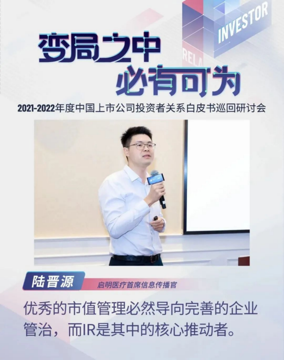 启明医疗首席信息传播官陆晋源先生带来“反向IR,市值管理的源泉”的主题演讲,他认为IR日常中与资本市场的交流是一种应对外因的“正向IR”,而改变内因也是IR的重要工作之一,是一种“反向IR”,反向IR的底层逻辑是根据公司业绩表现从公司内部梳理问题,再落实到实践中解决问题,推进公司市值管理。