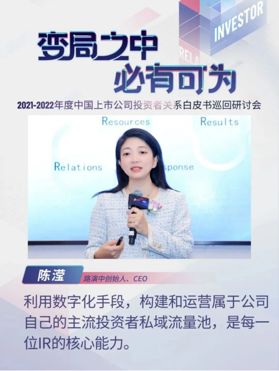 随后,路演中创始人、CEO陈滢女士发表了“数字化重构IR场景”主题演讲,她讲述了IR工作中的痛点及数字化在IR中的运用,分享了构建公司主流投资者私域流量的方法论。