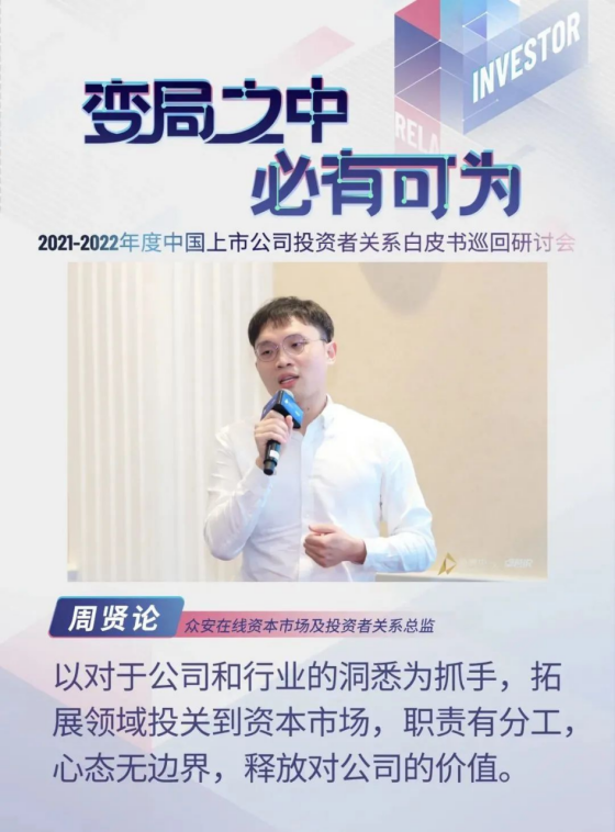 随着全球金融市场进一步互联互通,外资大幅流入国内市场,境外投资机构对国内股市的影响力逐步提升,A股、港股迎来更多机会,同时IR的跨境沟通能力也面临着更大挑战,众安在线资本市场及投资者关系总监周贤论先生发表了“跨境沟通与机构沟通体系构建”演讲,讲述了如何在瞬息万变的市场里做好本职工作,并让管理层认可IR工作的价值。