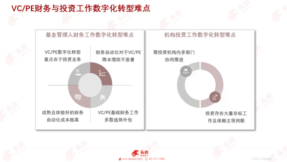 VC/PE在基金管理人基础财务工作数字化转型上的难点主要为引入RPA技术性价比低,降本增效不显著;在投资工作上的数字化转型则受限于大量非标且依赖主观判断的工作流程