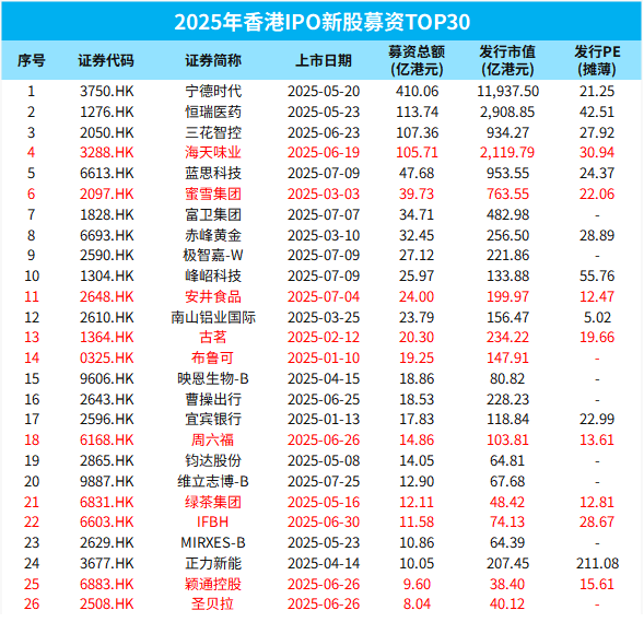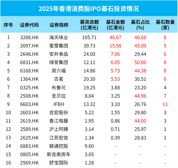 2025年前7个月,消费股IPO包括海天味业(106亿港元,A+H)、安井食品(24亿港元,A+H)等。相比之下,2024年则为毛戈平(27亿港元)、茶百道(26亿港元)。