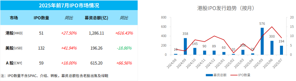 港股IPO活动已显著回暖。今年前7个月,港股有51只新股IPO上市(同比+27.5%),募资总额1,286亿港元(同比+616%)。港交所CEO称,目前有超两百宗上市申请正在处理中,内地企业赴港上市持续加速。