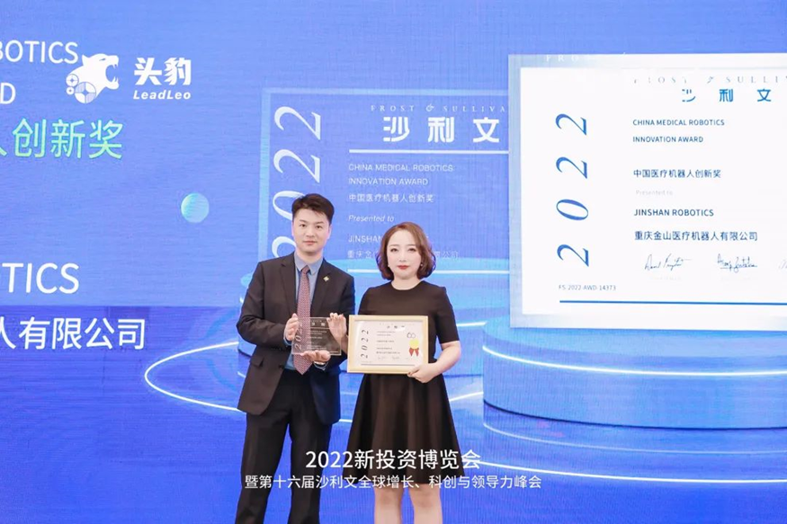 9月28日上午,在生物科技投资分论坛上, 基于近几年对中国智能制造市场的调研和分析,以及对业内相关公司的研究和评估,沙利文授予重庆 金山医疗机器人有限公司“2022中国医疗机器人创新奖”,由沙利文大中华区主管合伙人兼常务副总裁王晨晖先生为重庆金山医疗机器人有限公司创始人兼CEO王了女士颁奖。