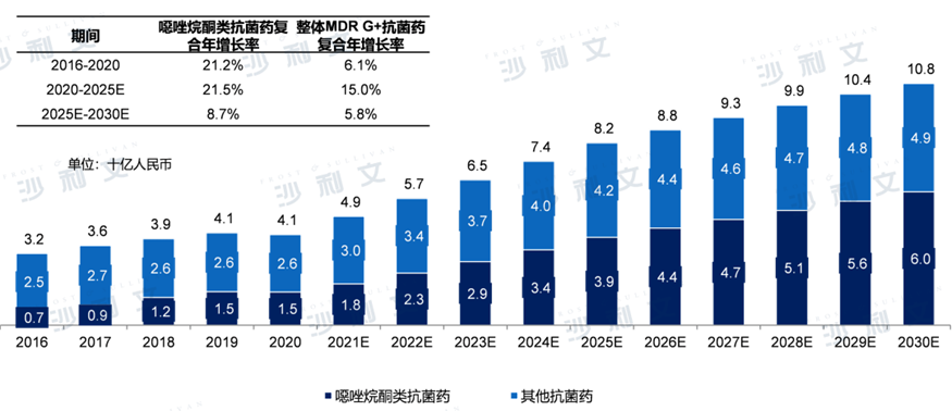 噁唑烷酮类药物在中国多重耐药性革兰氏阳性菌感染抗菌药物市场中占有一定的市场比例,且呈现增长趋势。2020年中国噁唑烷酮类抗菌药市场规模为15亿元人民币,高于2016年的7亿元人民币,复合年增长率为21.2%。中国噁唑烷酮类抗菌药市场规模将在2025年增至39亿元人民币,2030年增至60亿元人民币,2025年至2030年的复合年增长率为8.7%。