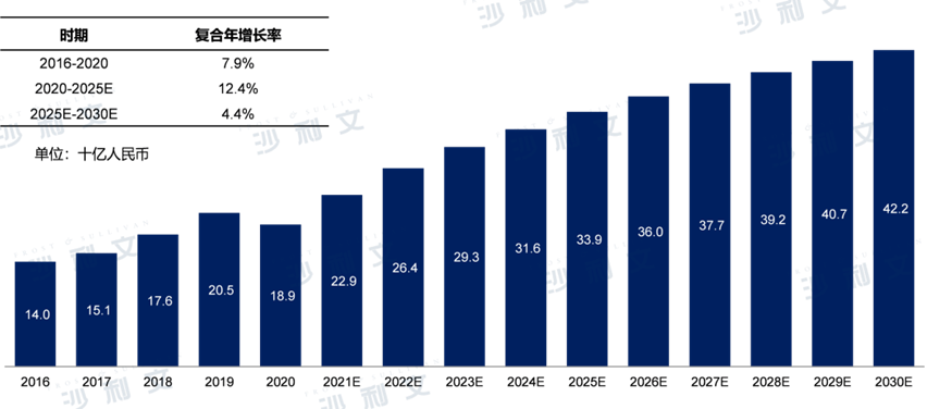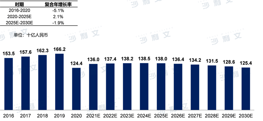 2016-2019年,中国多重耐药性革兰氏阴性菌感染的抗菌药物市场保持稳定增长,2020年由于疫情原因,中国多重耐药性革兰氏阴性菌感染的抗菌药市场较前一年略有下降,但整体仍呈现上升趋势,从2016年的140亿元人民币增至2020年的189亿元人民币,复合年增长率为7.9%。从2020年到2025年,该市场将增长到339亿元人民币,复合年增长率为12.4%,到2030年最终将达到422亿元人民币。