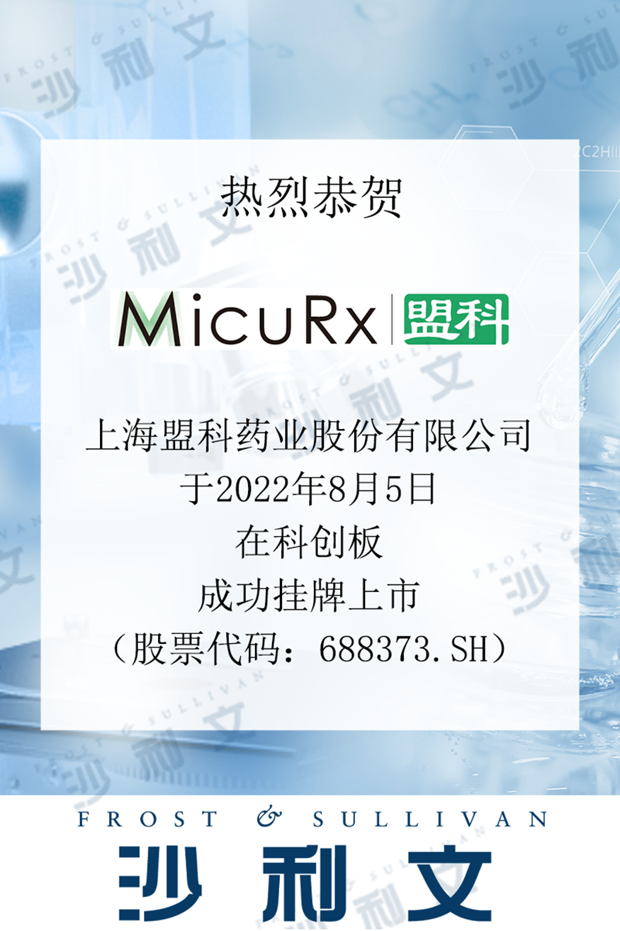 上海盟科药业股份有限公司(股票代码:688373.SH)于2022年8月5日成功登陆科创板。公司是一家以治疗感染性疾病为核心,拥有全球自主知识产权和国际竞争力的创新药企业。弗若斯特沙利文(Frost & Sullivan, 以下简称“沙利文”)特此热烈祝贺公司成功上市。