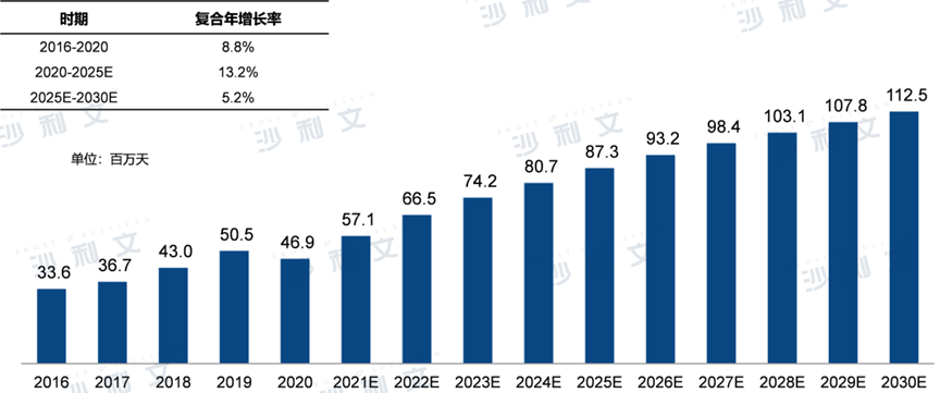 中国多重耐药性革兰氏阴性菌感染的抗菌药物总治疗天数从2016年的3,360万天增长至2020年的4,690万天,在此期间的复合年增长率为8.8%。中国治疗多重耐药性革兰氏阴性菌感染的抗菌药物治疗天数未来继续呈增长趋势,2025年增长至8,730万天,2020年至2025年的复合年增长率为13.2%,2030年将增至1.1亿天,2025年至2030年的复合年增长率为5.2%。