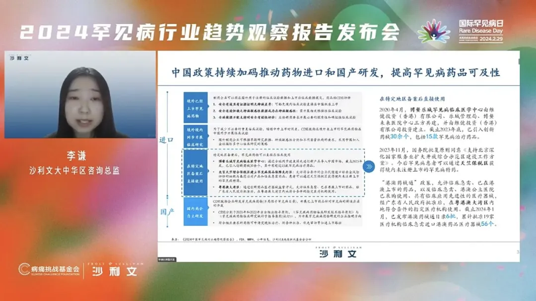 2024年2月28日,在2024年国际罕见病日即将来临之际,弗若斯特沙利文(Frost & Sullivan,简称“沙利文”)与北京病痛挑战公益基金会(简称“病痛挑战基金会”)联合举办的《2024中国罕见病行业趋势观察报告》(以下简称“《报告》”)发布会在线上圆满举办。