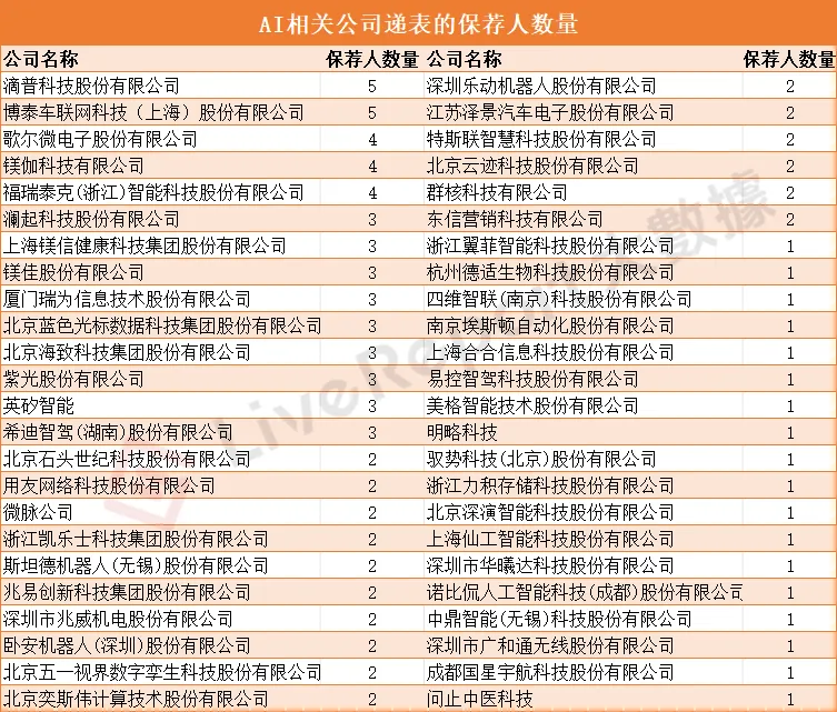 AI行业保荐人方面,据LiveReport统计,48家递表公司中,独家保荐的有18家,联席保荐的有30家,其中滴普科技及博泰车联网的保荐人多达5家;歌尔微电子、镁伽科技及福瑞泰克的保荐人有4家。