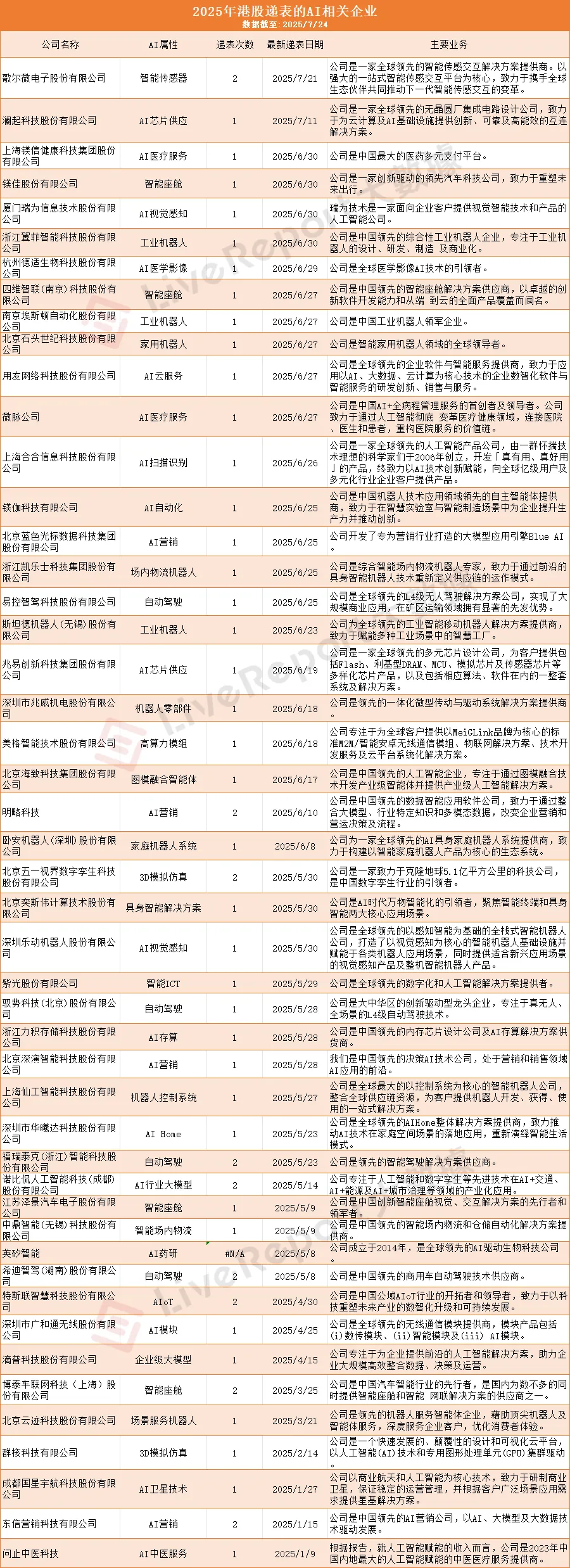 据LiveReport大数据统计,截至2025年7月24日,今年已向港交所递交上市申请但还未上市的公司有214家(含过1家聆讯),其中按AI行业划分的递表公司有48家,占比22.43%。