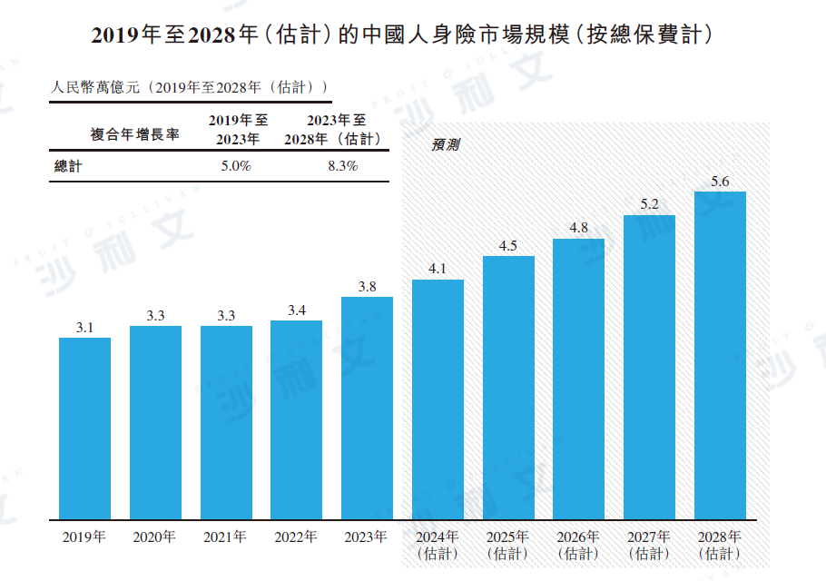按总保费计,中国的人身险市场规模从2019年的人民币3.1万亿元增至2023年的人民币3.8万亿元,复合年增长率为5.0%。预计到2028年,按总保费计的中国人身险市场规模将达到人民币5.6万亿元,2023年至2028年的复合年增长率为8.3%。