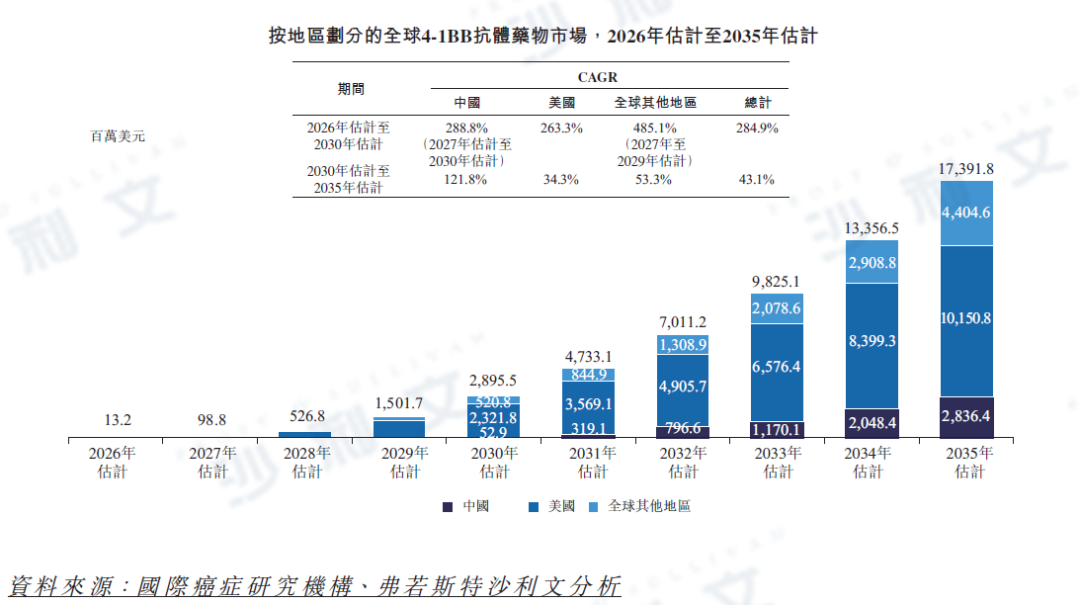 预计全球4-1BB抗体市场在2026年、2030年及2035年将分别达到1,320万美元、29亿美元及174亿美元,这是由于肺外神经内分泌癌、小细胞肺癌、胆道癌、食管鳞状细胞癌、非小细胞肺癌、胃癌、黑色素瘤、尿路上皮癌及淋巴瘤等癌症类型(其中大多数缺乏靶向治疗)的患者群体庞大,2024年有超过200万人且预计到2035年将超过300万人。该增长反映出2026年至2030年的年均复合增长率为284.9%,2030年至2035年为43.1%,这是由于临床试验中有超过10个全球4-1BB抗体管线,且该机制能够通过T细胞激活及PD-L1升高增强PD-1缓解率,实现快速的市场渗透,从而加速相关增长。预计美国4-1BB抗体市场在2026年、2030年及2035年将分别达到1,320万美元、23亿美元及102亿美元,2026年至2030年的年均复合增长率为263.3%,2030年至2035年为34.3%。预计中国4-1BB抗体市场在2027年、2030年及2035年将分别达到90万美元、5,290万美元及28亿美元,2027年至2030年的年均复合增长率为288.8%,2030年至2035年为121.8%,该增长受到替代治疗方案有限的肺外神经内分泌癌及小细胞肺癌等适应症的临床开发所支持。2027年至2030年预计的年均复合增长率下降,是由于较大的基数自然导致较低的增长率。下图显示全球4-1BB抗体药物的市场规模: