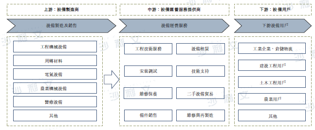 设备运营服务市场按价值链可分为三个部分:1)上游设备供应商;2)中游设备运营服务商;3)下游设备用户。上游设备供应商主要从事设备制造及销售,包括(但不限于)工程机械设备、支护系统及模架系统、电气设备、农业机械设备和医疗设备等。中游设备运营服务商主要提供设备租赁、施工安装、维修保养等服务。下游设备用户来自多元行业,包括(但不限于)工业、仓储物流、建设工程、土木工程和农业等领域。