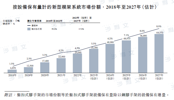 中国盘扣式脚手架的设备保有量由2018年的687万吨增加至2022年的2,564万吨,复合年增长率为39.0%,预计将于2027年进一步增至6,457万吨,2023年至2027年复合年增长率为17.9%。2022年,中国盘扣式脚手架的设备保有量为2,564万吨,其中约1,923万吨(或约75%)来自设备运营服务提供商。