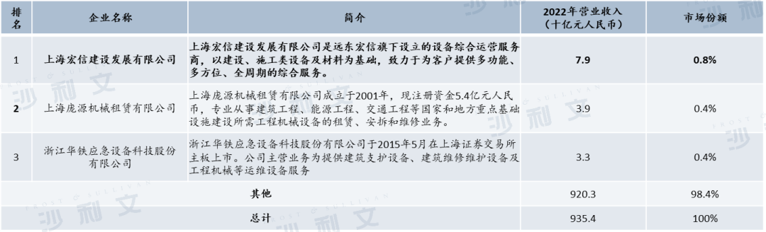 中国的整体设备运营服务市场极为分散,按收入计,2022年的前三大参与者合计仅占市场总规模的1.6%,逾15,000名中小规模的参与者占据余下的98.4%市场份额。按收入计,宏信建发于2022年位列第一名,占0.8%的市场份额。