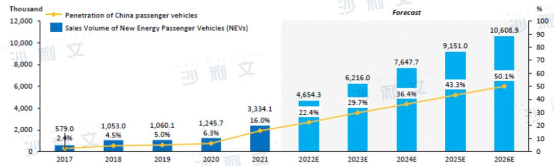 根据沙利文报告,新能源乘用车的销售量从2017年的约57.9万辆增加到2021年的约334.1万辆,过去五年的年复合增长率约为54.9%。随着新能源乘用车成本的下降和技术的进步,性能的提高,市场可能会从需求方面得到实质性的刺激,预计到2026年将进一步增长到约1,060.9万辆,在接下来的五年里,年复合增长率约为26.0%。