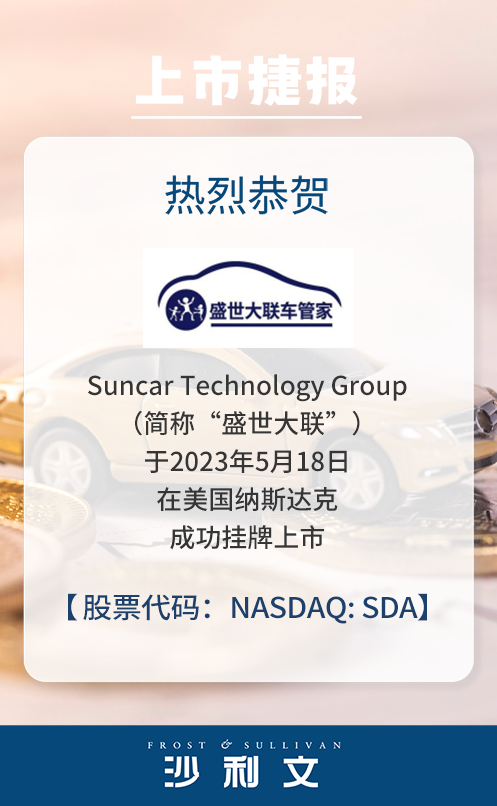 Suncar Technology Group(股票代码:NASDAQ: SDA)于2023年5月与Goldenbridge Acquisition Limited 正式完成合并,并于5月18日通过SPAC方式在纳斯达克挂牌上市。集团是中国领先的数字化企业汽车售后服务和在线汽车保险中介服务商。弗若斯特沙利文(Frost & Sullivan, 以下简称“沙利文”)为Suncar Technology Group上市提供独家行业顾问服务,特此热烈祝贺其成功上市。