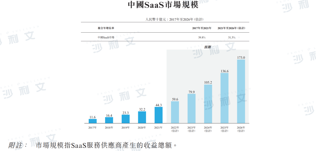 下图显示2017年至2026年中国SaaS供应商按收益计的过往及预测市场规模: