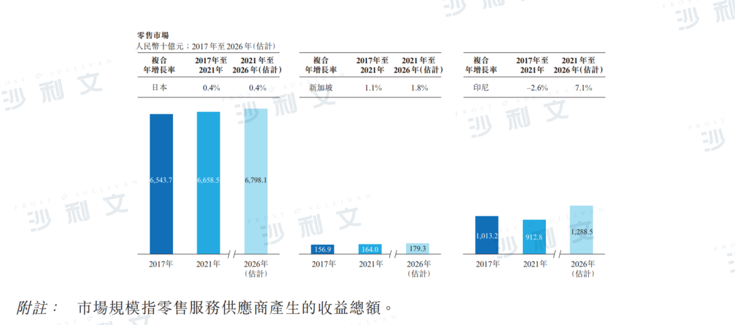 由于新加坡及日本市场相对成熟,预期两个国家的市场规模将分别由2021年的约1,640亿元人民币及6.7万亿元人民币增加至2026年的1,793亿元人民币及6.8万亿元人民币。此外,上述国家(日本、新加坡及印尼)的零售销售及营销服务市场具有相对分散的国内竞争格局。同时,一些成熟的外国零售销售及营销服务供应商也在这些国家开展业务。