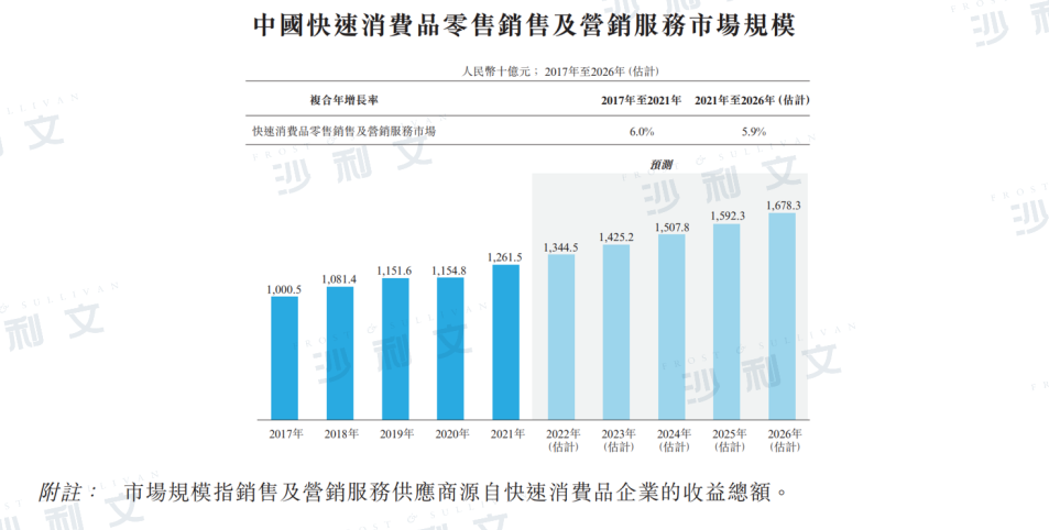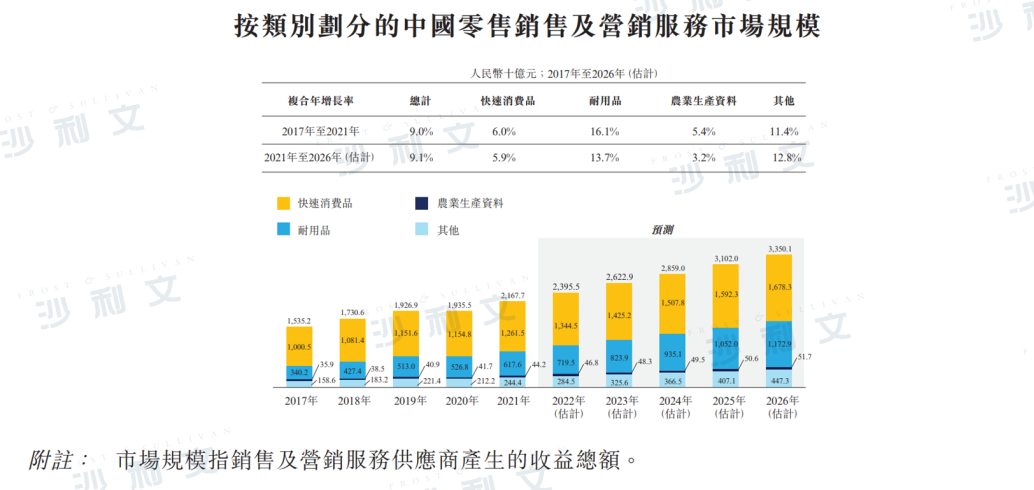 零售销售及营销服务市场竞争较为激烈,特别是在快速消费品类别中,因为过去数年快速消费品持续强劲增长,吸引了众多销售及营销服务供应商为彼等制定服务组合及策略。耐用品市场规模在同期取得最高年复合增长率约为16.1%,由2017年的约3,402亿元人民币增加至2021年的约6,176亿元人民币。