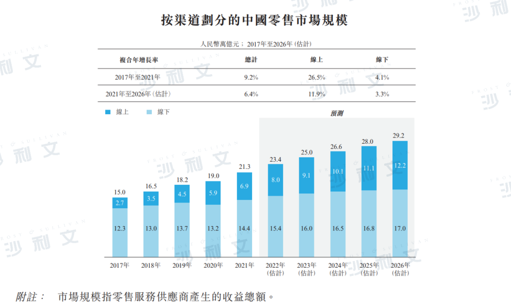 根据沙利文报告,中国零售市场可为线上和线下渠道。随着互联网基建和电子商务经济的快速发展,线上渠道在整体市场中高速增长,于2017年至2021年按26.5%的年复合增长率迅速增长,由2.7万亿元人民币增至6.9万亿元人民币。线下渠道占市场的绝大部分,由2017年12.3万亿元人民币增至2021年14.4万亿元人民币,年复合增长率为4.1%。随着线上渠道的获客及留客成本的增加,而线下渠道则能够获得更加深度的消费者体验,预期线下零售市场的规模将仍大于线上零售市场,并预期于到2026年,达17.0万亿元人民币,于2021年至2026年的年复合增长率3.3%,而线上零售市场预期于2026年增长至12.2万亿元人民币,于同期的年复合增长率为11.9%。