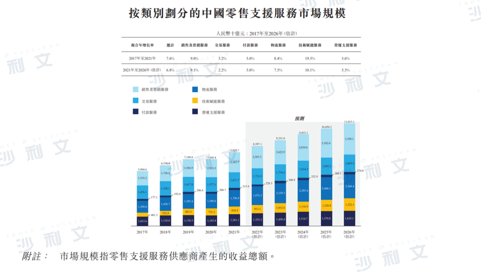 根据沙利文报告,中国零售支持服务市场的规模从2017年的5.9万亿元人民币增至2021年的7.9万亿元人民币,过去五年间的年复合增长率为7.6%。2020年市场的下降大多被销售及营销服务及技术赋能服务市场的持续增长所抵销。从2021年到2026年,预期零售支持服务市场的规模于未来五年,以年复合增长率6.8%增长至11.0万亿元人民币。其中,销售及营销服务板块占比零售支持服务市场超过50%,于2017年至2021年间实现了9.0%的稳定年复合增长率。