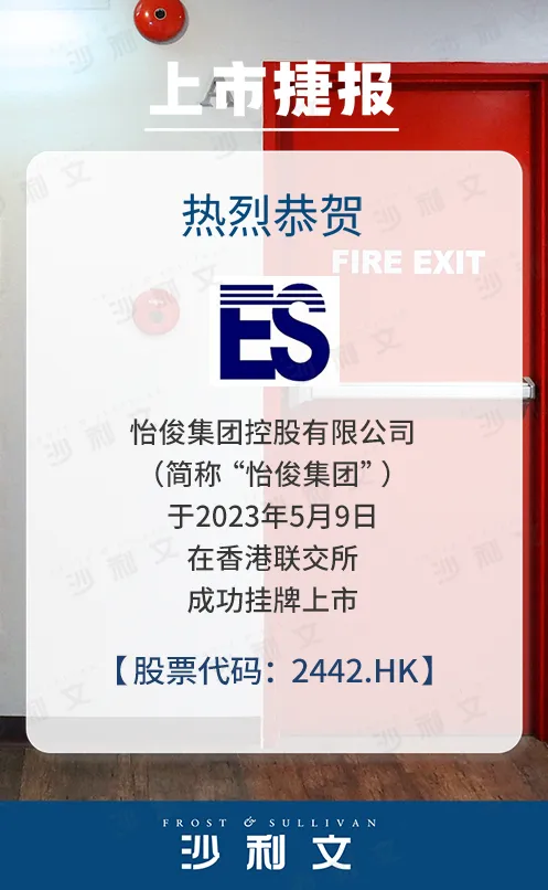 怡俊集团控股有限公司(股票代码:2442.HK)于2023年5月9日成功登陆香港资本市场。公司是香港一间专门从事被动消防工程的分包商,并为各类物业项目(包括公共基建及设施、商业大厦、工业大厦及住宅大厦)提供服务。弗若斯特沙利文(Frost & Sullivan, 以下简称“沙利文”)为怡俊集团控股有限公司上市提供独家行业顾问服务,特此热烈祝贺其成功上市。