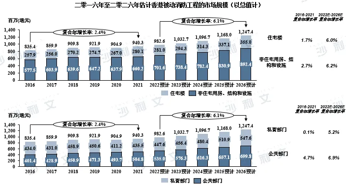 二零一六年至二零二一年,香港住宅楼宇及非住宅区域的被动消防工程分别录得约1.7%及2.7%的增长,而私营及公营界别对有关工程的需求分别录得约0.1%及4.7%的增长。香港被动消防工程市场的估计总值由二零一六年约835.4百万港元增加至二零二一年约940.3百万港元,复合年增长率约为2.4%,主要是由于建造业的可持续发展、对消防安全建设的严格要求及强制性市区重建计划的推出,带动了安装及翻新被动消防系统的需求所致。