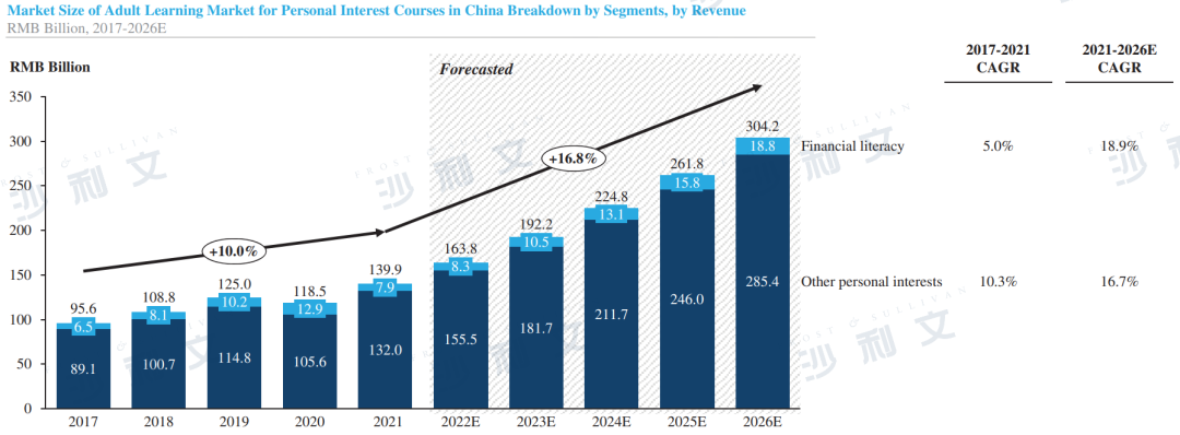 个人成人兴趣学习市场可以根据所提供的课程类型分成财商教育课程以及其他个人成人兴趣学习课程。财商教育课程主要为成人提供用以获取投资和财富管理能力的知识和技能,涵盖包括不同投资产品以及保险产品在内,针对拥有不同财务目标的群体而设计的课程内容。以收入计,2021年个人成人兴趣学习市场中的财商教育市场达到79亿元人民币,预计到2026年达到188亿元人民币,预计2021年至2026年间年复合增长率达到18.9%。