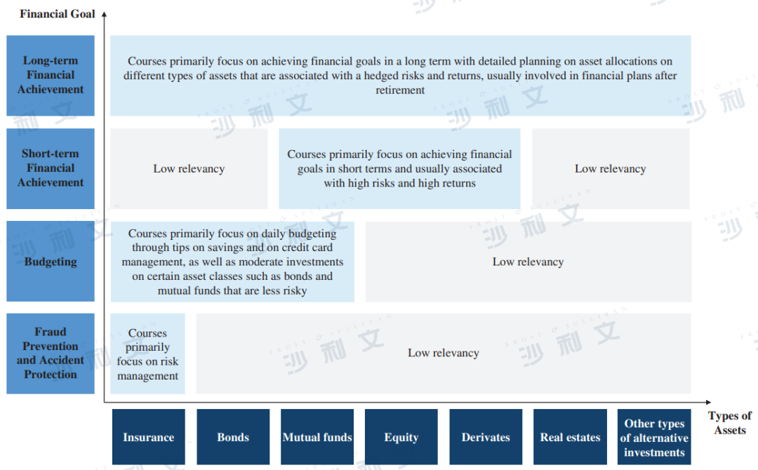 个人成人兴趣学习市场中的财商教育市场所提供的课程可以根据金融资产类型分为股票类、基金类、地产类、债券类、金融衍生工具以及其他另类投资资产,用于满足人们对于实现不同财务目标的需求。