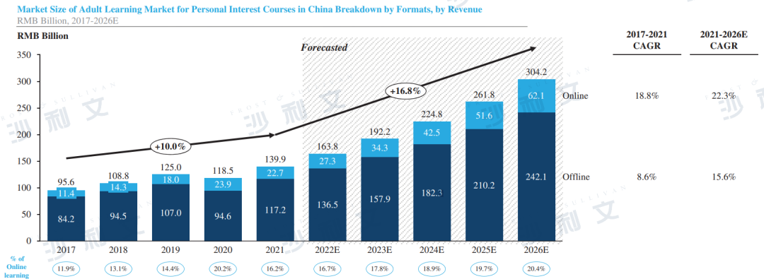 相较于线下学习,在线个人成人兴趣学习市场在过往期间经历了更快的增长,并且预计在2021年至2026年间继续保持这样的增速。以收入计,2021年在线个人成人兴趣学习市场规模达到227亿元人民币,从2017年的114亿元人民币增长至今年复合增长率达18.8%,预计到2026年市场规模达621亿元人民币,2021年至2026年间年复合增长率达22.3%。