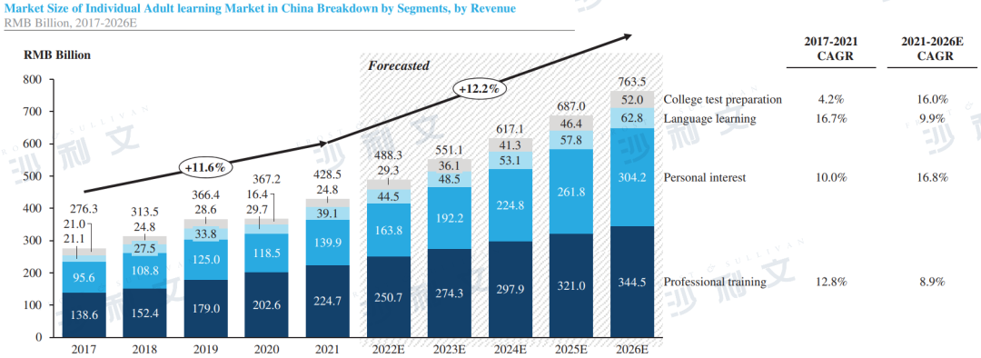 成人学习是指为希望获得知识和技能的成年人或在工作场所需要完成专业培训的成年人所提供课程,其中成人学习不包括针对由教育部或是中国其他教育机构授予的学位或文凭而提供的课程。根据沙利文报告,以收入计,中国成人学习市场规模从2017年的3,833亿元人民币增长至2021年的5,664亿元人民币,2017年至2021年期间年复合增长率为10.3%,并预计至2026年达到9,947亿元人民币,2021年至2026年间年复合增长率达11.9%。