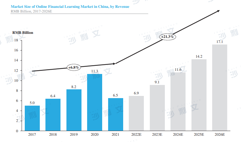 个人成人兴趣学习市场中的财商教育市场可以进一步分为在线学习以及线下学习,其中以收入计,个人成人兴趣学习市场中的在线财商教育市场从2017年的5亿元人民币增长至2021年的65亿元人民币,2017年至2021年间年复合增长率达6.8%,并预计到2026年增长至171亿元人民币。