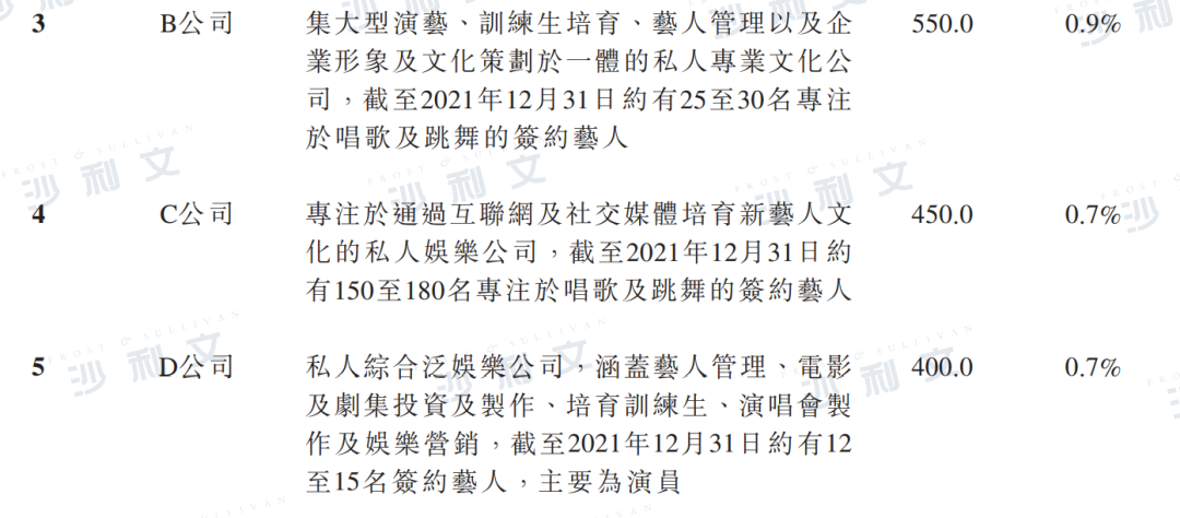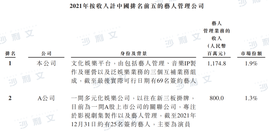 根据沙利文报告,以公司2021年艺人管理业务产生的收入计算,在中国所有艺人管理公司中排名第一,市场份额约为1.9%。