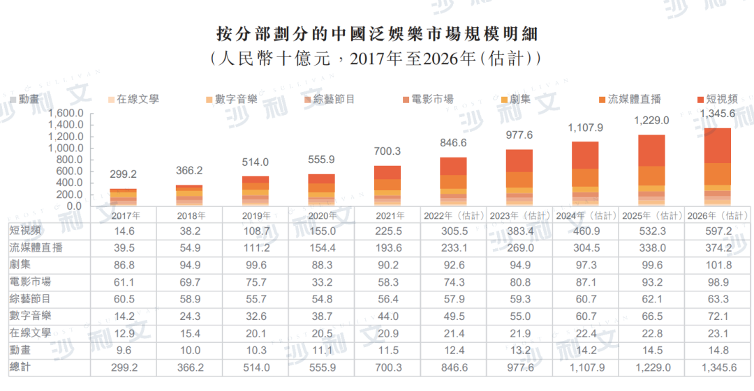 中国的泛娱乐市场于过往数年快速增长,主要受中国城镇居民文化娱乐内容人均支出增长的推动。根据沙利文报告,市场规模由2017年约人民币2,992亿元增加至2021年约人民币7,003亿元,2017年至2021年的复合年增长率为23.7%。预期总市场规模将于2026年达至约人民币13,456亿元,2021年至2026年的复合年增长率为4.0%。