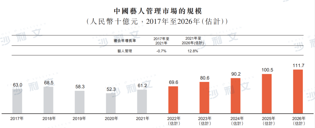 根据沙利文报告,中国艺人管理市场的规模预计将于2026年达至约人民币1,117亿元,2021年至2026年的复合年增长率为12.8%,这得益于专业艺人管理系统的发展、争夺受众的数字渠道的激增以及多样化的变现渠道。
