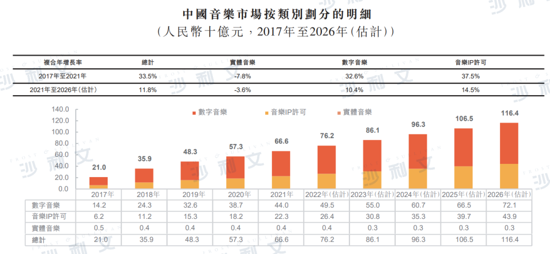 受听众愈来愈愿意购买数字音乐内容所推动,数字音乐市场的规模出现惊人的增长,由2017年的约人民币142亿元增加至2021年的约人民币440亿元,2017年至2021年的复合年增长率为32.6%。根据沙利文报告,数字音乐市场的规模于2026年可能达约人民币721亿元,2021年至2026年的复合年增长率为10.4%。相反,根据沙利文报告,由于互联网及移动技术的快速发展,于2017年至2021年期间,实体音乐市场的规模由约人民币5亿元减少至约人民币4亿元,并可能于2026年减少至约人民币3亿元。