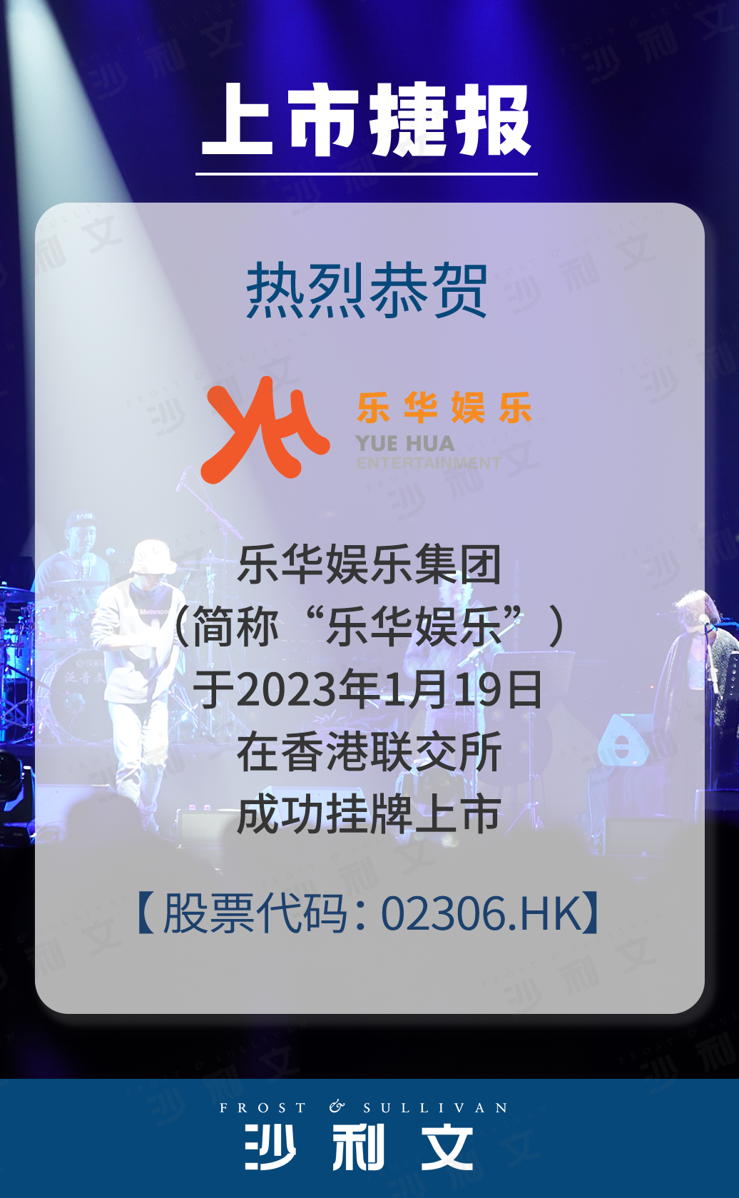 乐华娱乐集团(股票代码:02306.HK)于2023年1月19日成功登陆香港资本市场主板。公司是中国知名的艺人管理公司,按2021年艺人管理业务产生的收入计算,于中国艺人管理公司之中排名第一,市场份额为1.9%。弗若斯特沙利文(Frost & Sullivan, 以下简称“沙利文”)为乐华娱乐集团上市提供独家行业顾问服务,特此热烈祝贺其成功上市。